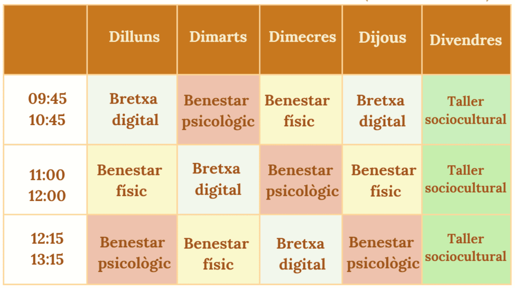 Activitats setmanals per al benestar físic, psicològic i digital, així com tallers socioculturals.