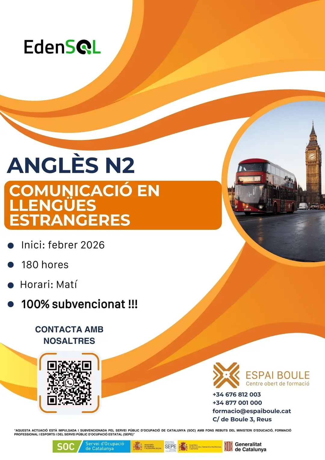 Aquesta actuació està impulsada i subvencionada pel Servei Públic d’Ocupació de Catalunya (SOC) amb fons rebuts del Ministeri d’Educació, Formació Professional i Esports i del Servei Públic d’Ocupació Estatal (SEPE).